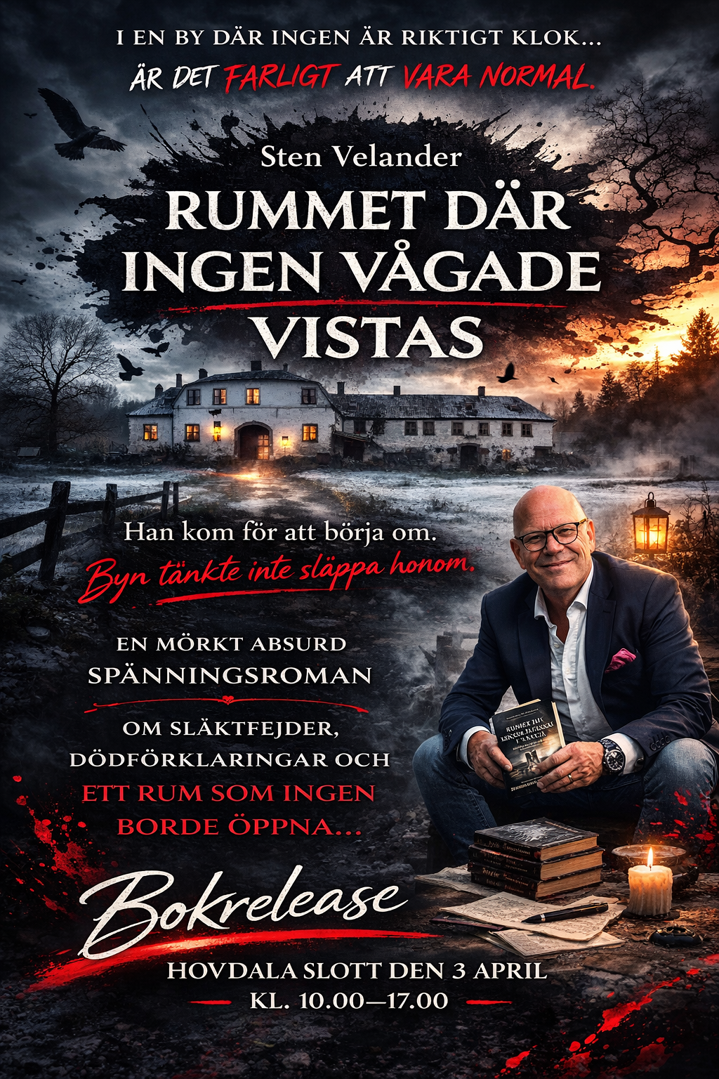 Lite om mig själv. Jag heter Sten Velander och är 64 år. Jag bor tillsammans med min fru Ulrika och schäferhunden Imma i Tormestorp som ligger i nordöstra Skåne. Efter flera år med arbete inom Region Skåne skrev Jag och gav ut min första roman genom Vistos förlag 2022. Jag har sedan dess givit ut ytterligare tre romaner. Just nu är den femmte romanen färdigskriven och kommer ut någon gång under 2027. Jag planerar att ge ut ytterligare en roman under 2028.